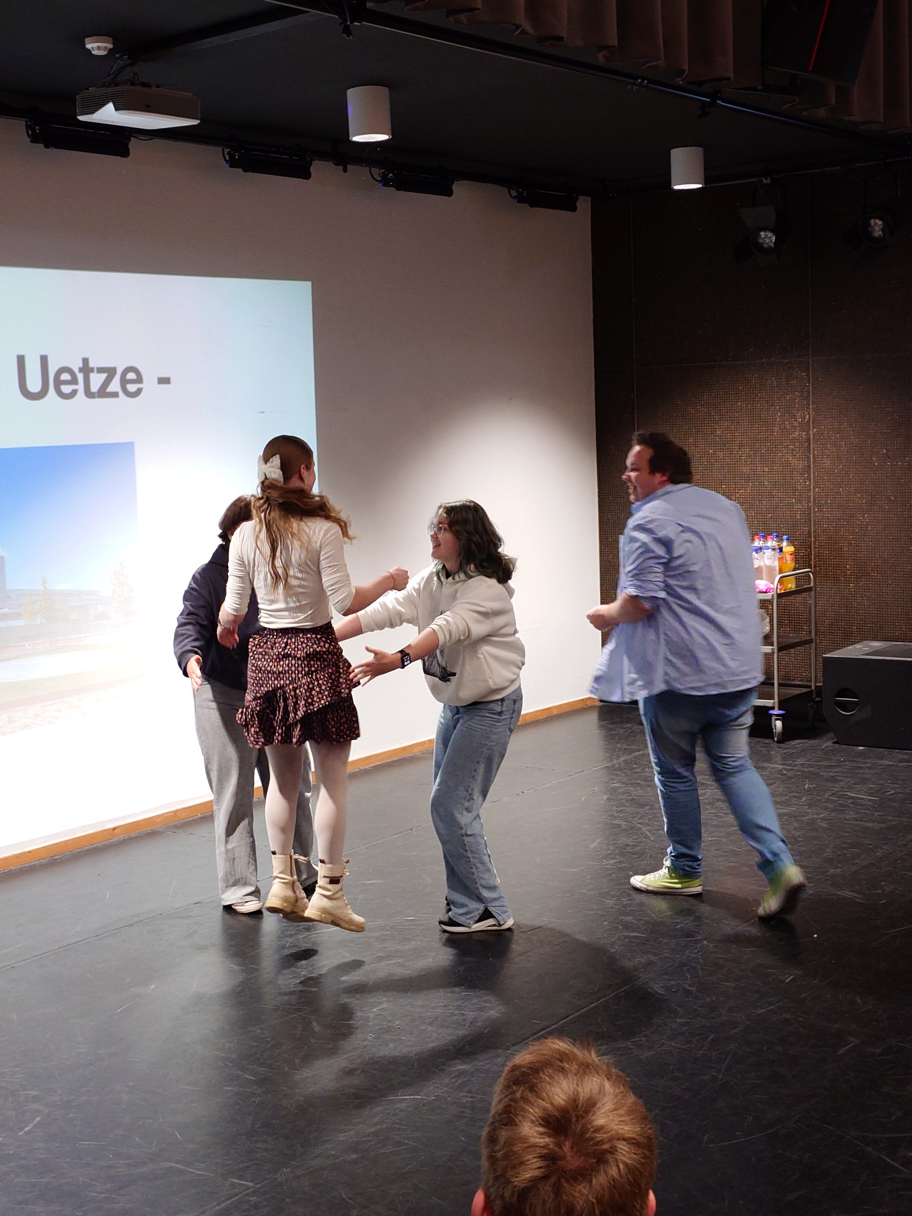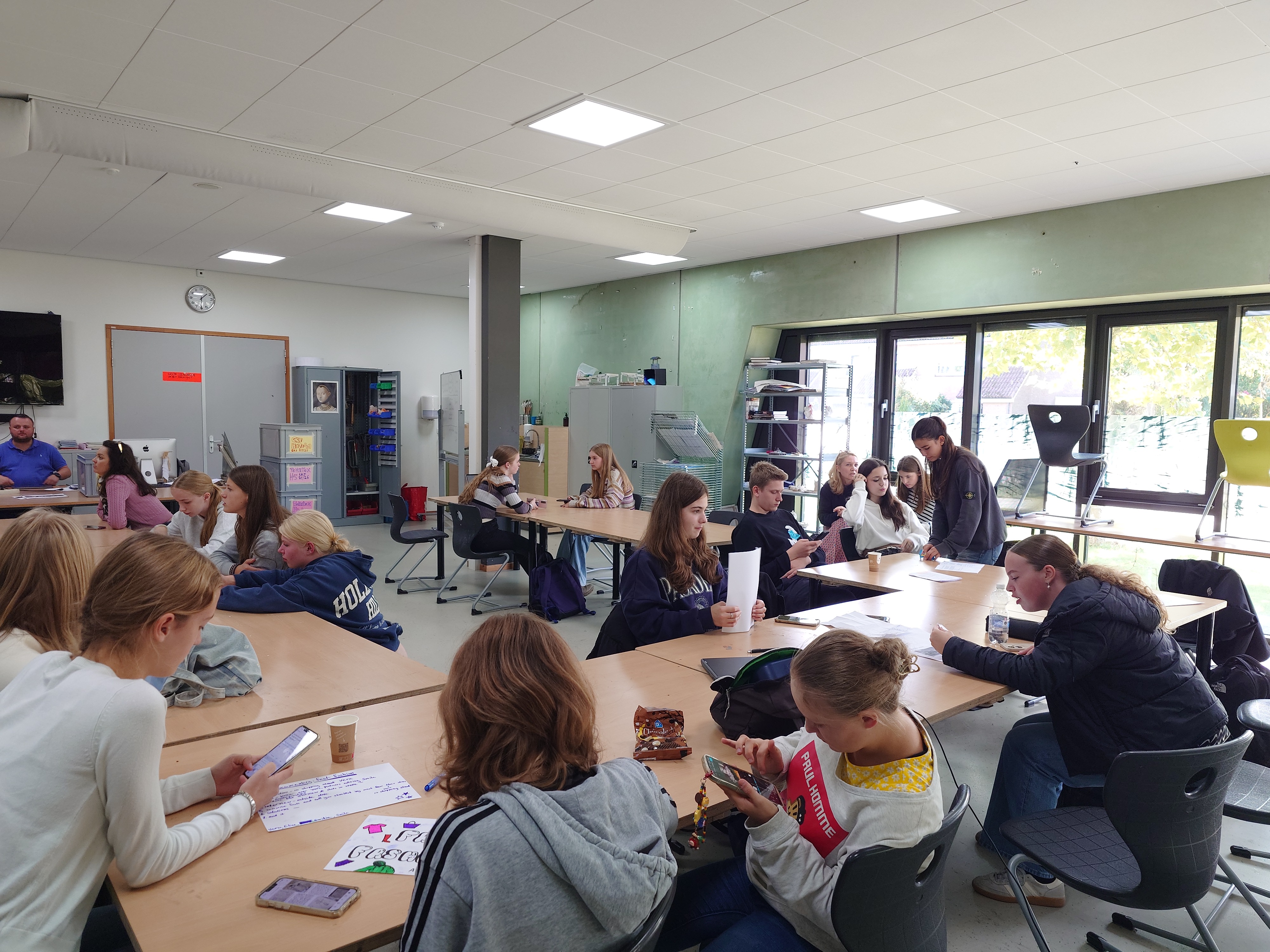 Der Sonntag stand den Reisenden zur freien Verfügung und einige Gastfamilien nutzten ihn für einen Ausflug nach Amsterdam, Groningen oder andere Aktivitäten. Der Montag begann im Dr. Nassau College mit einigen Kennenlernspielen, welche einige unserer Schülerinnen bereits aus ihrer Ausbildung als Paten kannten. Diese wurden von einer Theaterlehrkraft angeleitet und sorgten bei allen für gute Laune. Anschließend folgten allgemeine Informationen zum Verlauf der Woche und nachdem die Gruppen zusammengesetzt, die Themen ausgewählt und erste Recherchen durchgeführt waren, ging es für die Gruppe in das Zentrum von Assen. Die Schüler*innen mussten mit den Fahrrädern, wie bei einer Schatzsuche, sieben bekannte Plätze besucht, dort eine kleine Aufgaben erfüllt und dieses jeweilsmit einem Selfie dokumentiert.