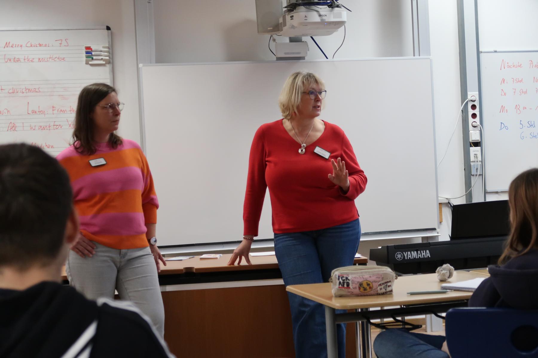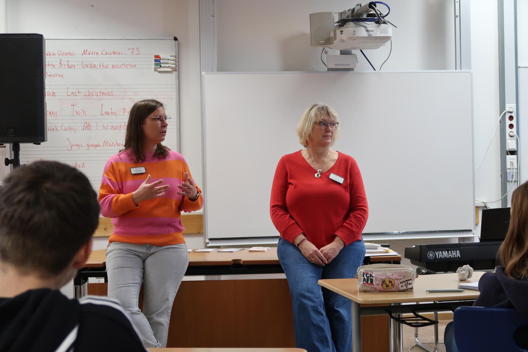 Diese schöne Rückmeldung haben die Mitarbeitenden des Hospizes in Celle von einer Gästin bekommen. Davon berichteten Sozialpädagogin Birthe Scott und die Ehrenamtliche Cordula Siebert bei ihrem Besuch der Religionsschüler*innen des 10. Jahrgangs des Gymnasiums Unter den Eichen am 11. Dezember 2025. Denn im Hospiz verwöhnen die zahlreichen Mitarbeitenden ihre Gäste mit Zuwendung, Berührungen wie das Einreiben von Hautöl und ganz viel Zeit. Das Hospizhaus in einem Wohngebiet in Celle hat zehn Zimmer für seine Gäste und ein Besucherzimmer zum Übernachten. Das Hospizteam umfasst sechs Palliativmediziner, Pflegekräfte, eine Sozialarbeiterin, einen Seelsorger und eine Vielzahl an Ehrenamtlichen, die den Sterbenden jeden Wunsch, sei es z.B. ein Besuch im Landgestüt Celle oder des kleinen Festes im großen Garten, schnellstmöglich in Zusammenarbeit mit dem „Wünsche-Wagen“ erfüllen.