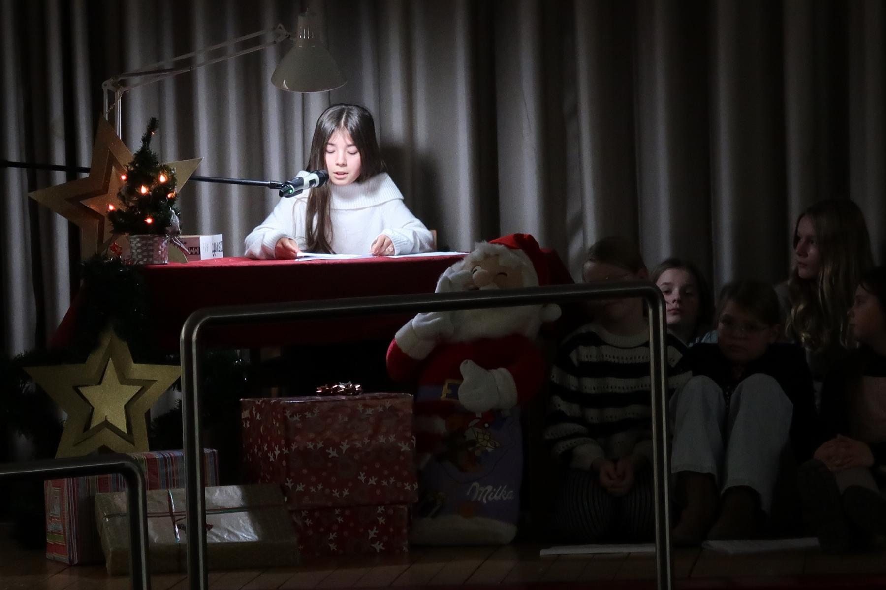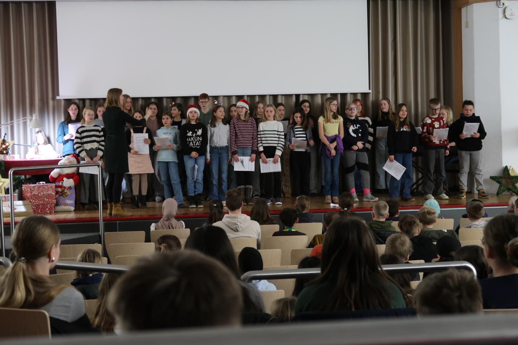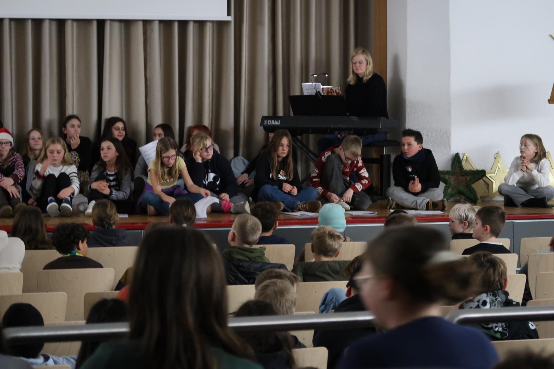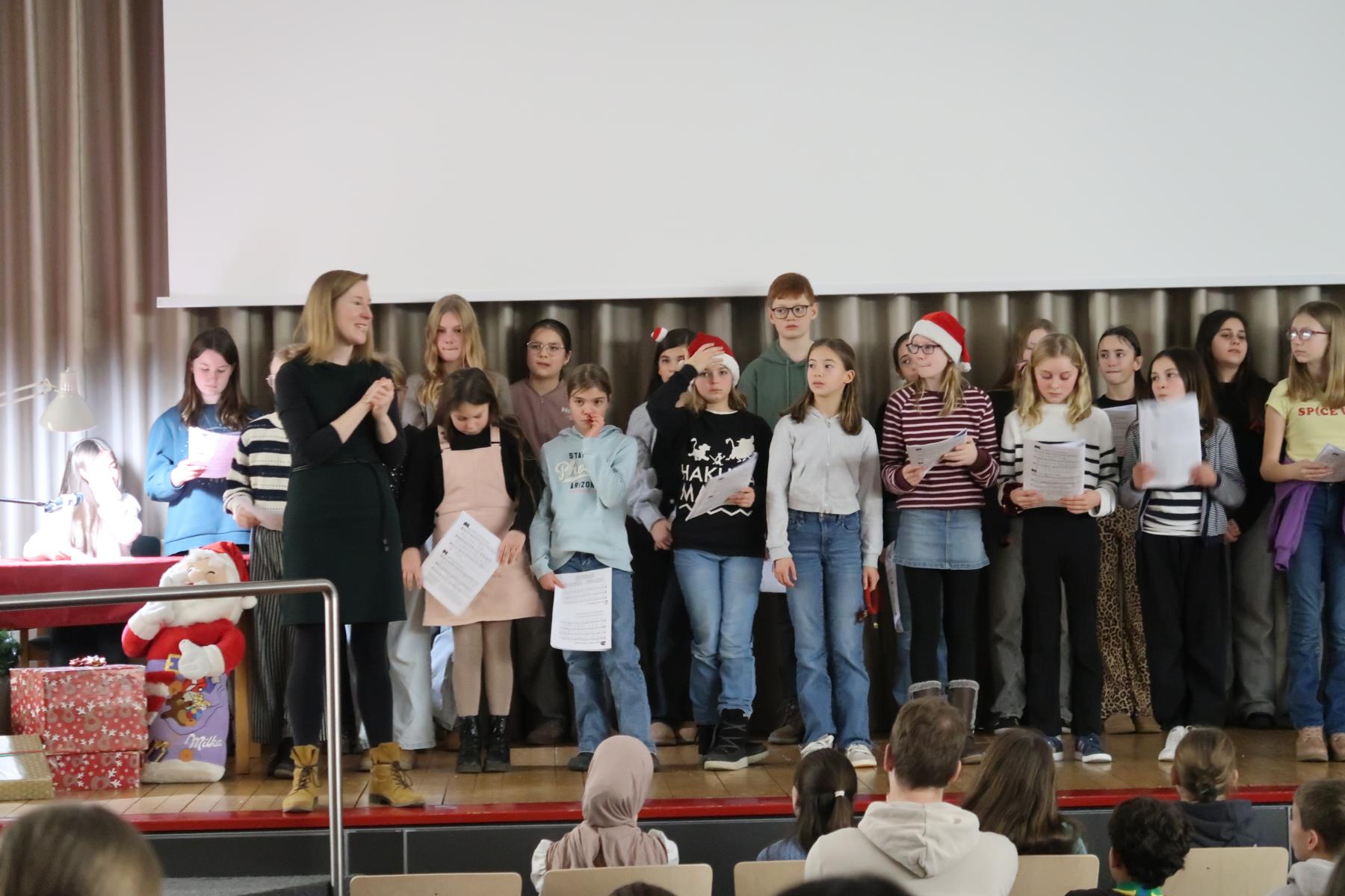 … dann hat die Musical-AG unter der Leitung von Jasmin Sönksen und Christine Krüger wieder in der hübsch dekorierten Agora für die fünften und sechsten Klassen für weihnachtliche Stimmung gesorgt. Beschwingt begrüßte die Musical-AG mit „Feliz Navidad“ die Mitschülerinnen und Mitschüler in der letzten Stunde vor den Weihnachtsferien. Dann las die Siegerin des Vorlesewettbewerbs, Zeynep Özdem, den ersten Teil von „Mira und der schiefe Weihnachtsbaum“ vor. Diese Geschichte entstand mit der Hilfe von KI nach den Vorgaben der Kinder der Musical-AG, die sich überlegt hatten, was eine Weihnachtsgeschichte alles beinhalten sollte. In der Geschichte geht es darum, dass, gerade wenn nicht alles perfekt ist, es dennoch ein gelungenes Weihnachtsfest werden kann. Zwischen den einzelnen Abschnitten sang die Musical-AG zusammen mit den Zuhörerinnen und Zuhörern „Schneeflöckchen, Weißröckchen“ und „Fröhliche Weihnacht“. Zum Abschluss wurde gemeinsam der Ohrwurm „Stern über Bethlehem“ gesungen, bevor alle dank der Musical-AG fröhlich aus der Agora in die Weihnachtsferien strömten.