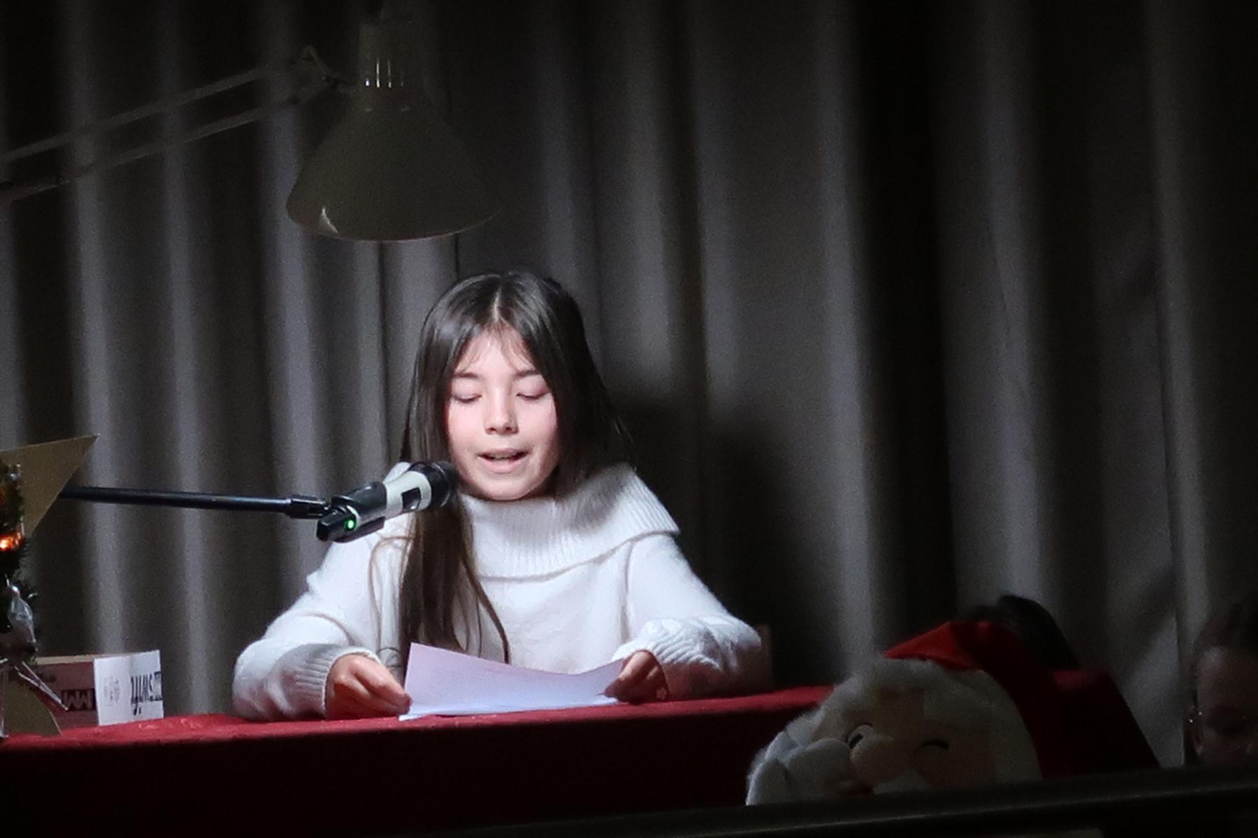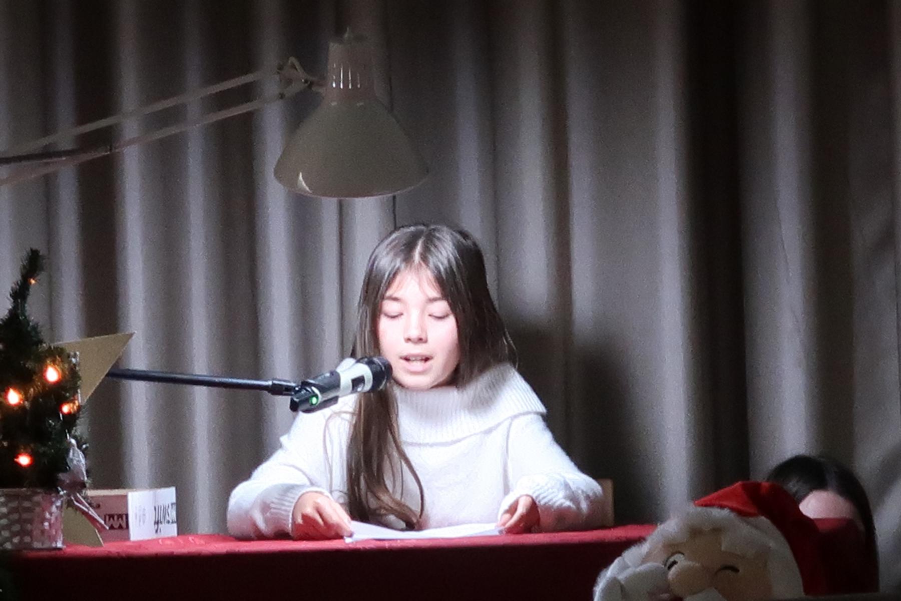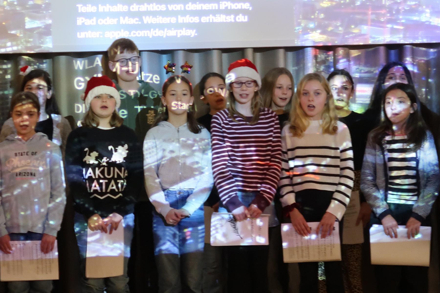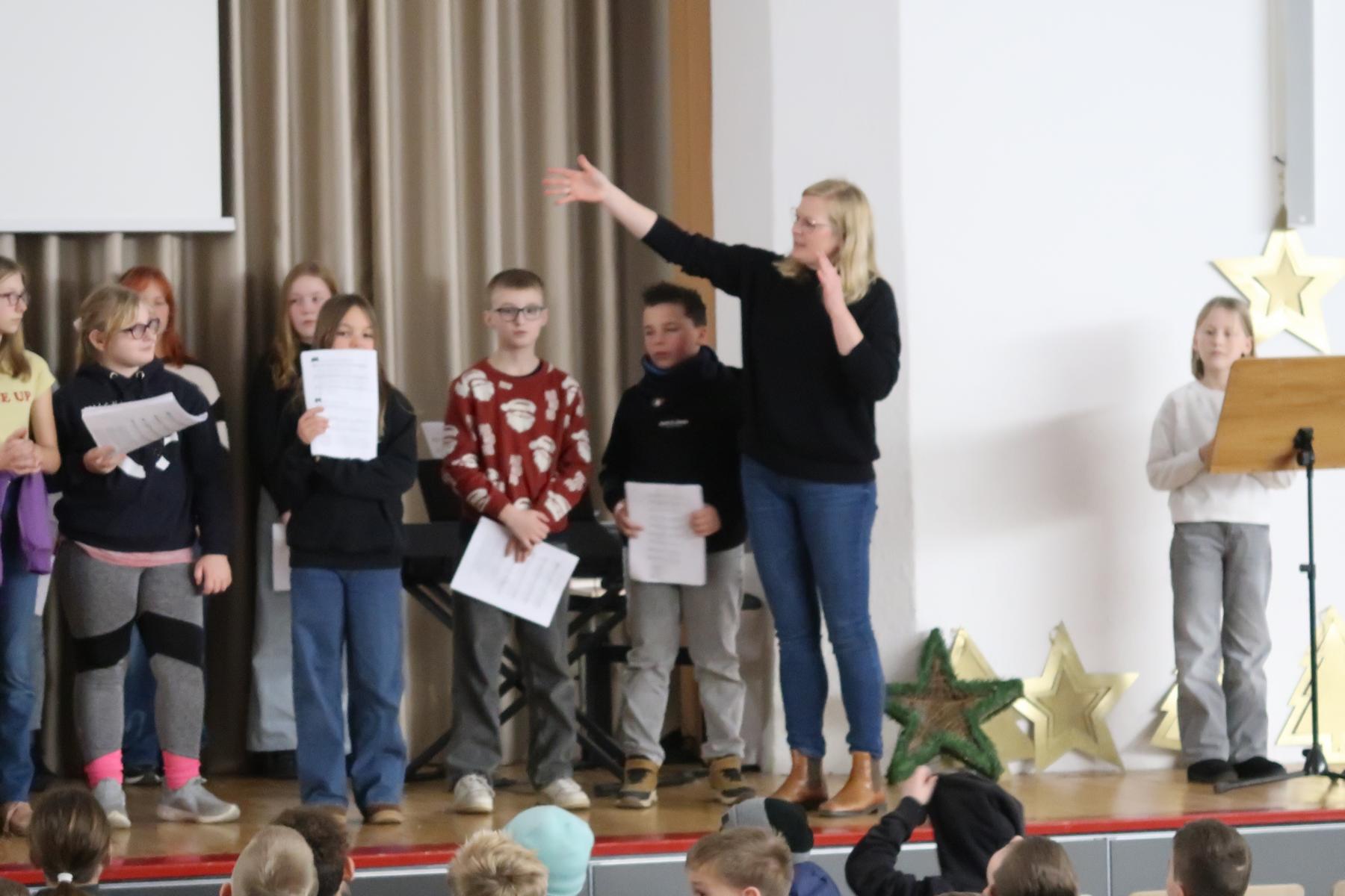 … dann hat die Musical-AG unter der Leitung von Jasmin Sönksen und Christine Krüger wieder in der hübsch dekorierten Agora für die fünften und sechsten Klassen für weihnachtliche Stimmung gesorgt. Beschwingt begrüßte die Musical-AG mit „Feliz Navidad“ die Mitschülerinnen und Mitschüler in der letzten Stunde vor den Weihnachtsferien. Dann las die Siegerin des Vorlesewettbewerbs, Zeynep Özdem, den ersten Teil von „Mira und der schiefe Weihnachtsbaum“ vor. Diese Geschichte entstand mit der Hilfe von KI nach den Vorgaben der Kinder der Musical-AG, die sich überlegt hatten, was eine Weihnachtsgeschichte alles beinhalten sollte. In der Geschichte geht es darum, dass, gerade wenn nicht alles perfekt ist, es dennoch ein gelungenes Weihnachtsfest werden kann. Zwischen den einzelnen Abschnitten sang die Musical-AG zusammen mit den Zuhörerinnen und Zuhörern „Schneeflöckchen, Weißröckchen“ und „Fröhliche Weihnacht“. Zum Abschluss wurde gemeinsam der Ohrwurm „Stern über Bethlehem“ gesungen, bevor alle dank der Musical-AG fröhlich aus der Agora in die Weihnachtsferien strömten.