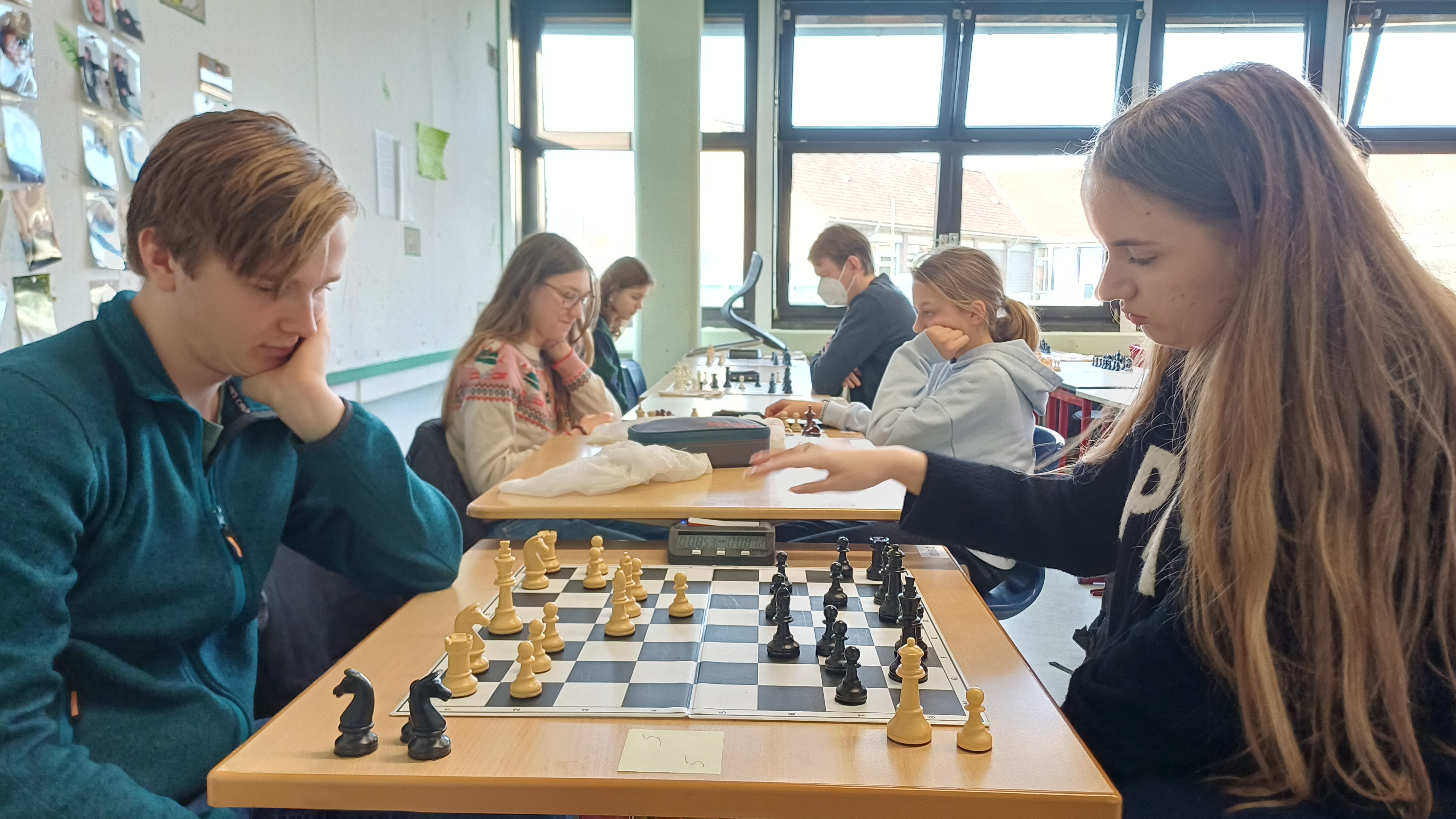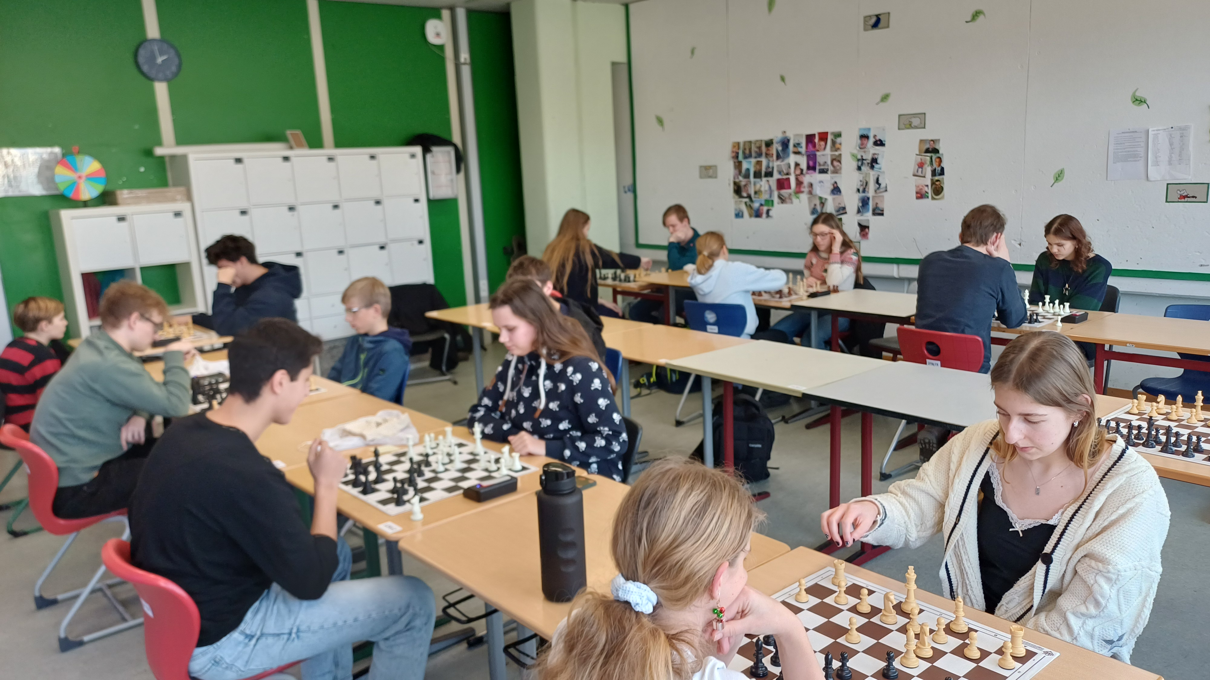 Insgesamt 15 Spieler, darunter übrigens auch Herr Manschke , der als Lehrkraft sozusagen außer Konkurrenz spielte, traten an und spielten im Klassenraum der 8L Schach. Das Turnier war von äußerlich angespannter Ruhe sowie dem sanften Klacken der Schachuhren, zugleich aber von kämpfenden Gedanken und aufreibenden Konstellationen geprägt.