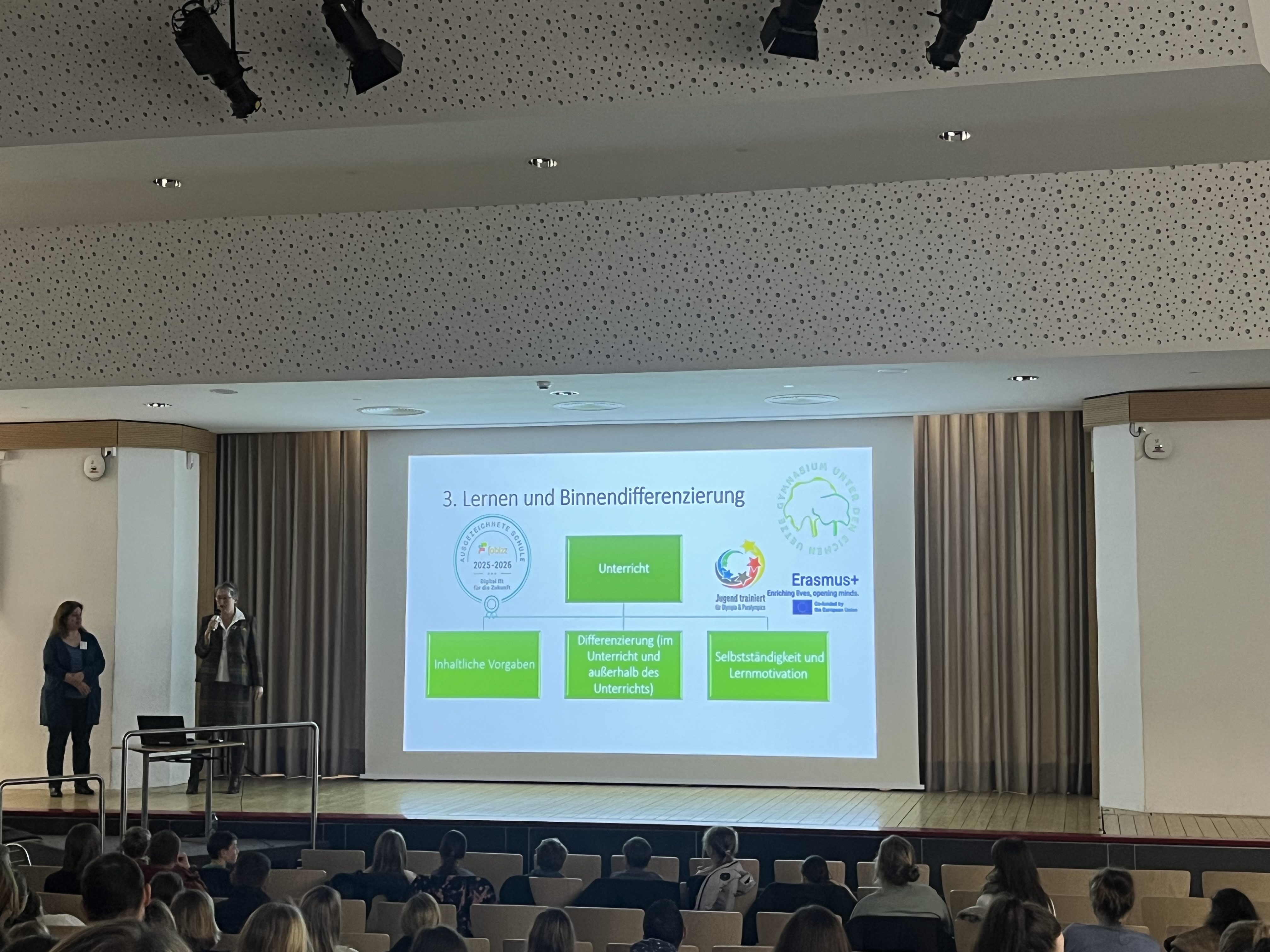 Auch die verschiedenen Formen der Leistungsrückmeldung wurden ausführlich erklärt: von ILE und LEB über Zeugnisse bis hin zu Elternsprechtagen sowie Zielvereinbarungs- und Zielüberprüfungsgesprächen. Dabei wurde deutlich, wie wichtig uns eine transparente Feedbackkultur und die enge Zusammenarbeit mit den Eltern sind. Ergänzend informierten Frau Dr. Wundram und Frau Loosveld über mögliche Schulabschlüsse am Gymnasium, das Ganztagsangebot und das vielfältige Schulleben mit Arbeitsgemeinschaften, Projekten und schulischen Veranstaltungen. Das Fahrtenkonzept sowie die Beratungsangebote für Schülerinnen und Schüler und Eltern rundeten die Präsentation ab.