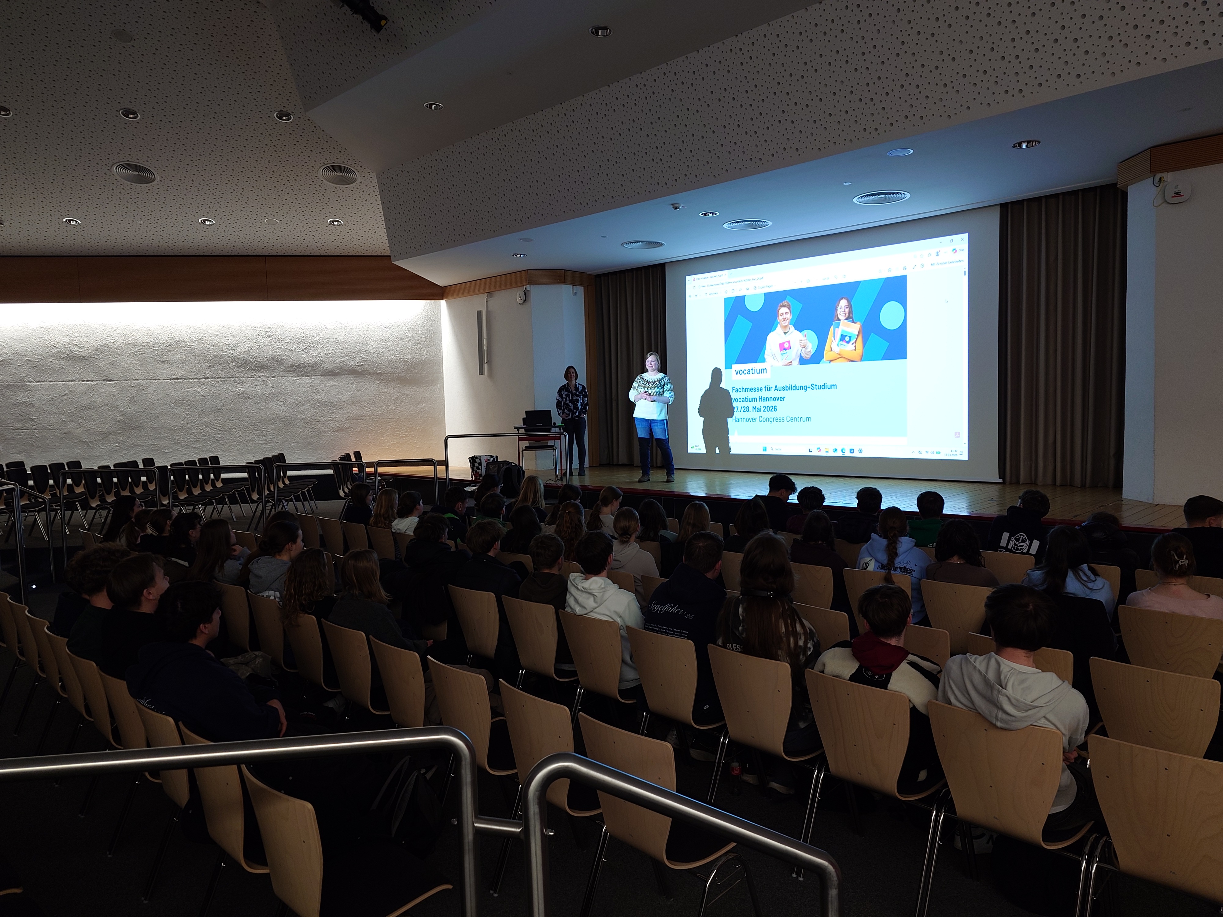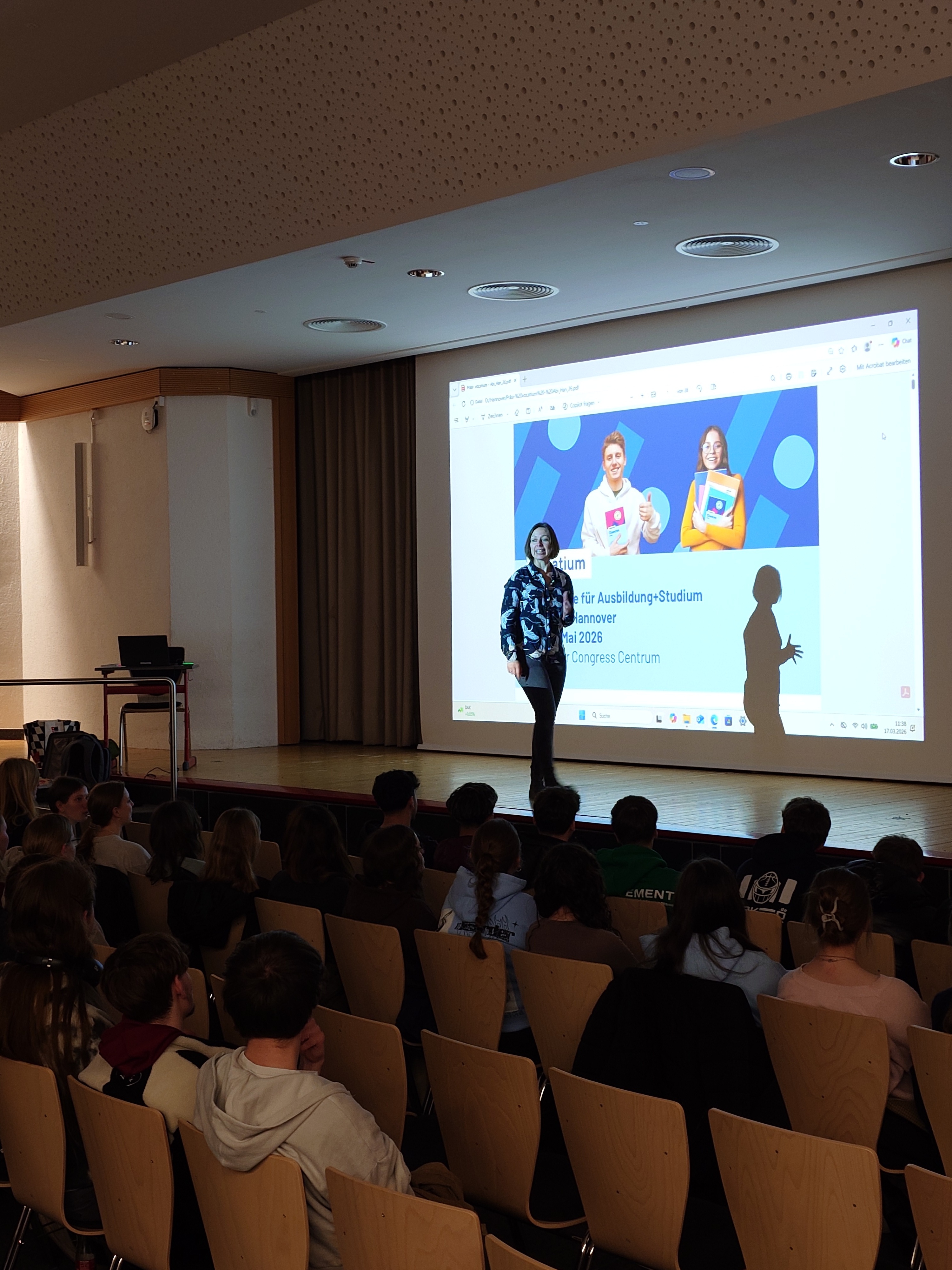 Auf der Vocatium-Messe in Hannover werden die SchülerInnen und Schüler unseres 12. Jahrgangs im Rahmen der Berufsorientierung persönliche Gespräche mit Personen aus Unternehmen, Behörden und Universiäten führen können und dabei spannende Erfahrungen sammeln und “echte” Infos aus der Wirtschaft sowie der Berufswelt erhalten. Zur Vorbereitung auf diese Messe fand am 17.03.2026 in der AGORA unseres Schulzentrums die Vorbereitung mithilfe von Frau Müller aus dem Vocatium-Team statt. Ende Mai starten dann alle SchülerInnen gespannt zu ihren Terminen auf der Messe und haben außerdem die Gelegenheit sich alle Stände der dortigen Unternehmen anzuschauen und sich dadurch ausgiebig zu informieren.