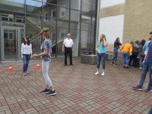 “Alkohol im Straßenverkehr” wurde in bewährter Zusammenarbeit von der Polizei Burgdorf durchgeführt. Eine Beamtin klärte die Zehntklässler über die rechtlichen Konsequenzen von Fehlverhalten im Straßenverkehr auf. Dazu zählt neben zu viel Alkohol oder der Konsum von Drogen auch das Benutzen vom Handy beim Fahrradfahren. Ein Beamter ließ die Zehntklässler mit einer Rauschbrille, welche 0,8 Promille simulierte, verschiedene Aufgaben bewältigen.