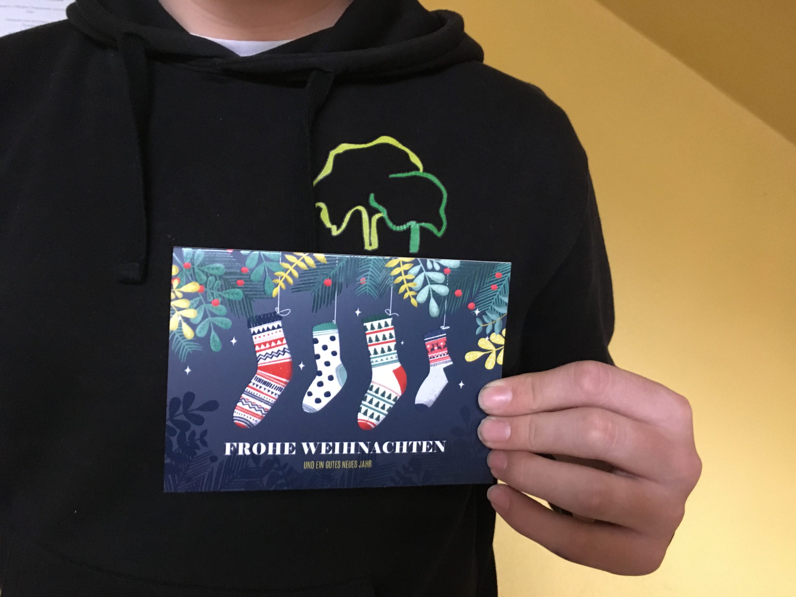 Die IG bietet in der Eingangshalle des Gymnasiums in den großen Pausen festliche Weihnachtskarten zum Verkauf an. So kann jeder innerhalb des Schulzentrums vorweihnachtliche Grüße versehen mit einem Schokololli (mit Fairtrade-Siegel) versenden.